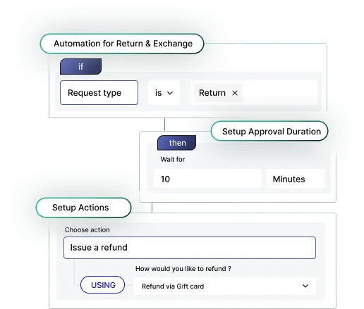 Créez des règles personnalisées pour approuver automatiquement les demandes de retour et d'échange en éliminant les tâches manuelles. Accélérez le traitement des retours et des échanges pour une expérience client fluide.