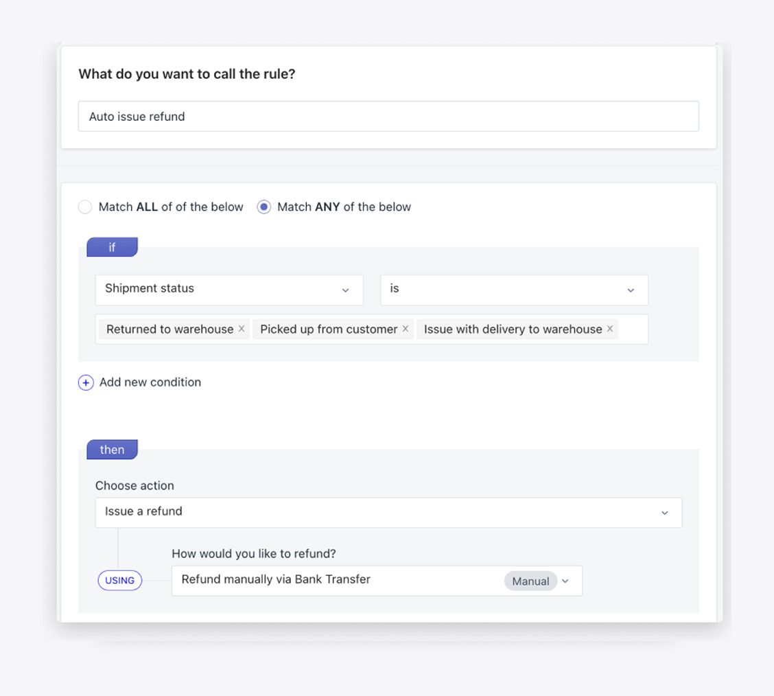 Auto-approve returns by reason. Create exchange orders after inspection. Issue refunds when conditions are met. Notify customers at every step. 15+ configurable conditions. Unlimited rules.