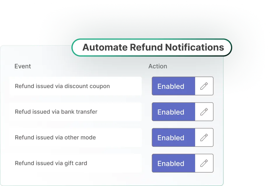 Inform customers immediately when their refund is issued. Store credit, bank transfer, or gift card, Craft unique message for each refund method.