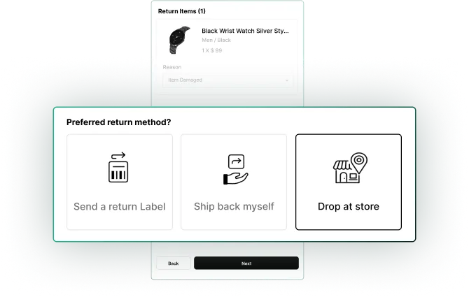 Offer return methods tailored to specific return reasons. Send a return label, let customers ship items themselves, or request them to drop items at your store.